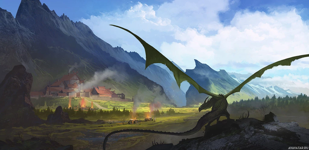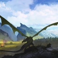 human presence; a small wooden structure with smoke coming from its chimney, indicating that people live here despite the proximity to the dragon's lair. The overall atmosphere suggests a story where humans and