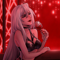 a black outfit and has a somewhat displeased or annoyed expression on her face while holding up a wine glass as if she's about to take a sip. The background is dimly lit with