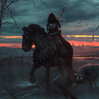 an outdoor setting during what seems to be twilight or dawn, given the warm light in the sky. There is a structure that looks like a castle or fortress in the distance, adding to the medieval or fantasy atmosphere of the image.