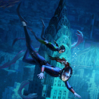 animated characters, a girl and a boy, underwater. They are wearing diving suits with helmets and have goggles on their heads. The boy is holding onto the girl's hand, indicating they may be in a situation that requires them to rely on each other. In the background, there is an underwater structure that resembles a large stone pillar or monument, which is surrounded by seaweed and various