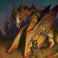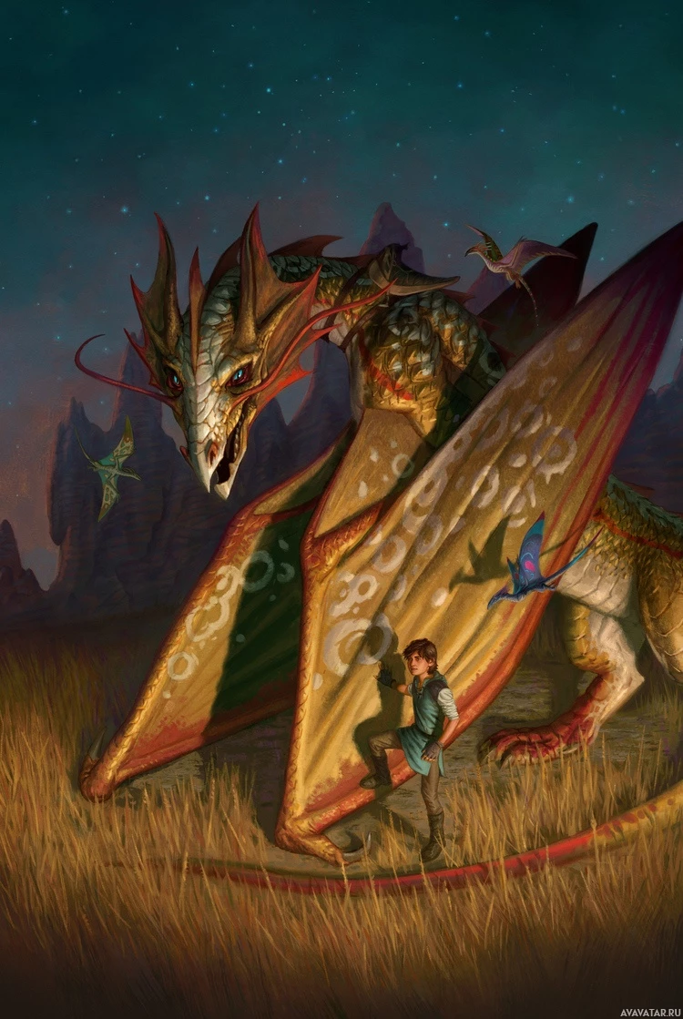 a human figure in the foreground, who seems to be interacting with the dragon; it's not clear from this image alone whether the person is friendly towards the dragon or if there is a potential conflict between them. The overall atmosphere of the picture suggests a narrative that could be part of
