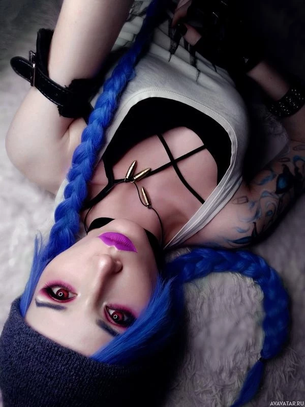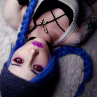 blue hair and makeup, wearing what appears to be cosplay attire that could be associated with the character Jinx from the game "League of Legends." They are lying on