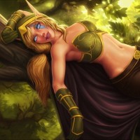 the fantasy game "Warcraft," which is set in a magical realm. The character is an elf, as indicated by the pointed ears and fantasy-style armor, and she appears to be in a relaxed state, lying on her back in what looks like