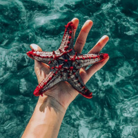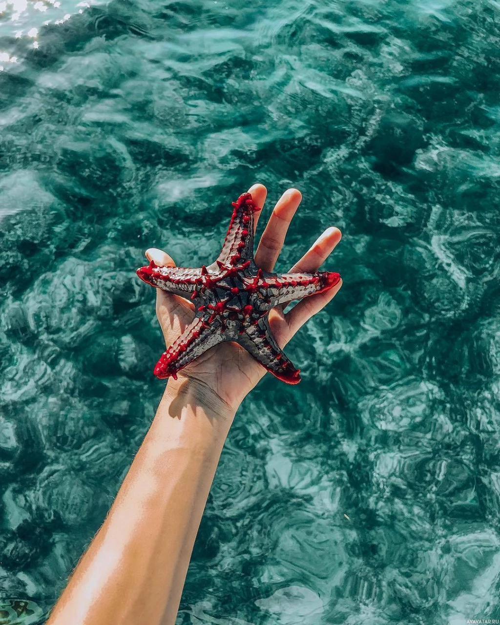 На картинке изображена рука человека, держащая в воде красную морскую звезду, на фоне голубого океана. Морская звезда красного цвета с белыми точками, что характерно для некоторых видов морских звезд.