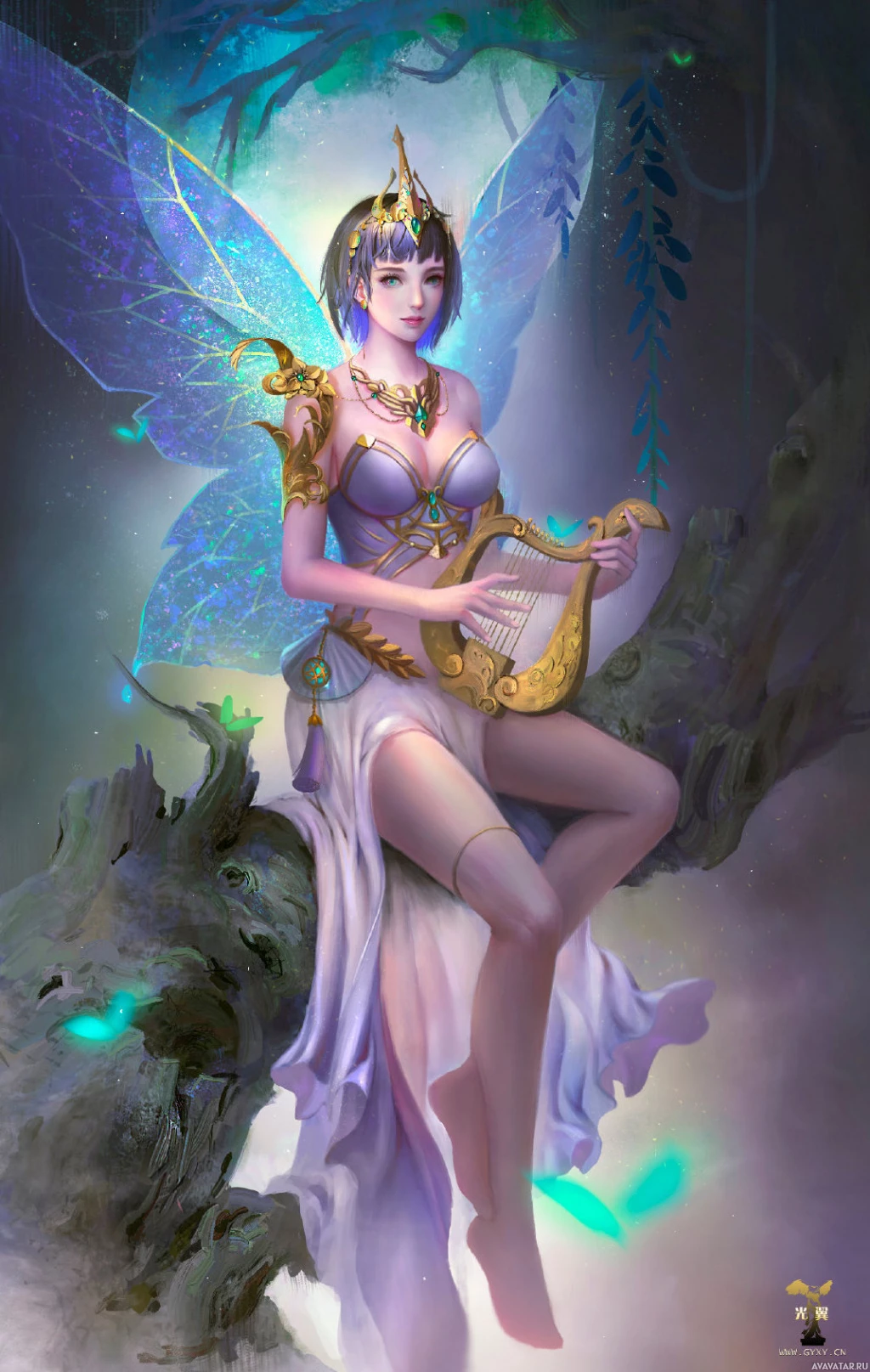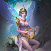 The image depicts a fantasy-themed illustration featuring an elf or fairy character. She has large,