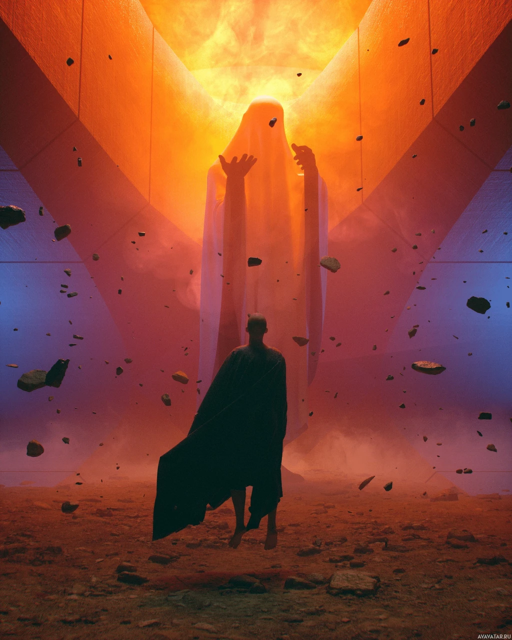 a silhouette of a person standing with their back to the viewer, facing an ominous figure that appears to be emanating power or energy from a pyramid-like structure in the background. This central figure seems to be controlling the situation or