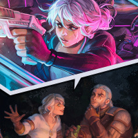 relaxed setting with a campfire nearby. The artwork captures the dynamic between these characters from