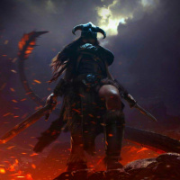 На картинке изображен персонаж из серии видеоигр "The Elder Scrolls". Этот персонаж - воин с мечом и щитом, одетый в доспехи, напоминающие скандинавские или кельтские узоры. Они стоят на скалистом выступе, а под ними горят языки пламени, что наводит на мысль о напряженной битве или вулканической среде в игровом мире. Персонаж, похоже, находится в позе готовности или триумфа.