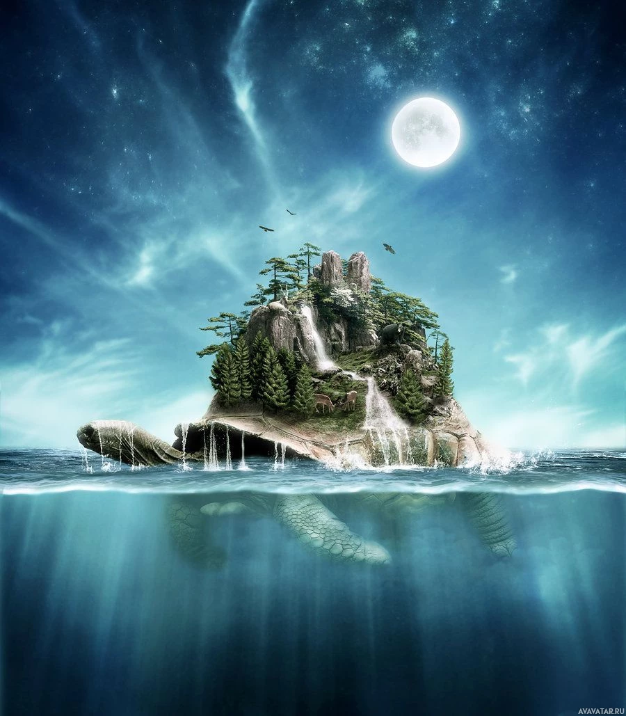 На картинке изображен остров в океане, на вершине которого покоится черепаха. На заднем плане видно залитое лунным светом небо и летающих вокруг птиц. Эта сцена передает ощущение спокойствия и уединения, а остров выглядит как небольшая автономная экосистема посреди бескрайних вод.