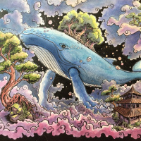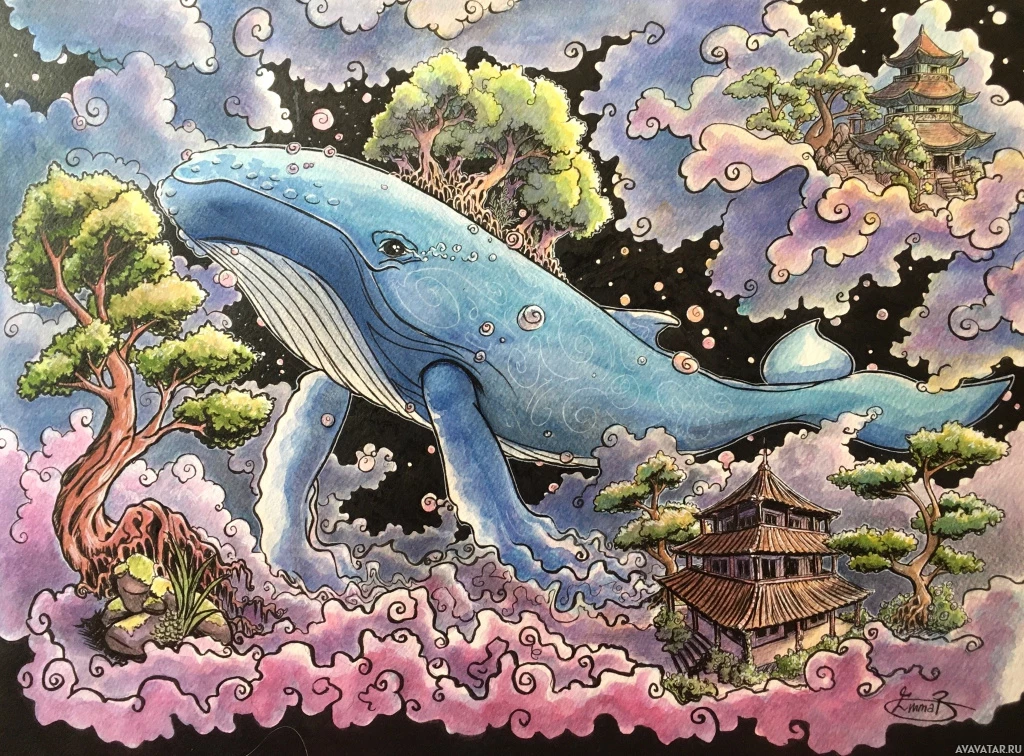 The image depicts a whale floating in the sky with its tail curled. Below the whale, there are elements of