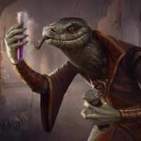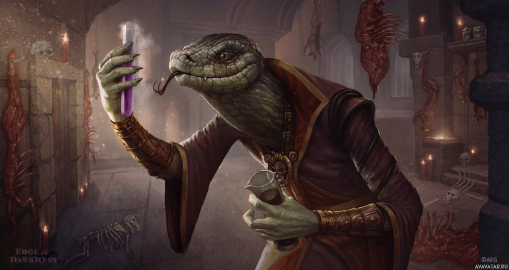 The image depicts a fantasy-themed character that appears to be a mutant or monster. This creature has the body of a human but with an alligator head and is holding what looks like a scroll or book in one hand while gesturing with its other hand, which could suggest it is engaged in some sort of ritual or