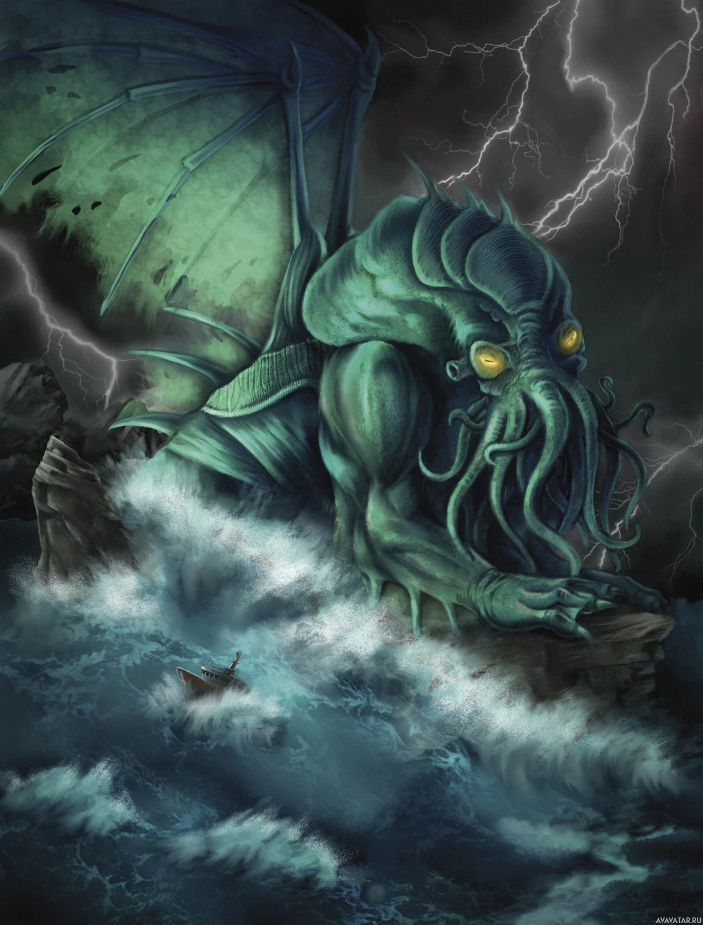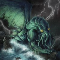 menacing creature that resembles Cthulhu, a fictional deity created by author H.P. Lovecraft. This creature has tentacles and appears to be rising from the ocean amidst stormy