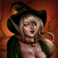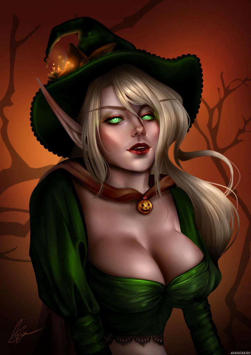 На картинке изображена героиня женского пола, одетая в эльфийскую тематику, включая заостренные уши, напоминающие эльфийские, и шляпу ведьмы. Она изображена в стиле фэнтези или мифологии. Выражение ее лица, кажется, выражает озабоченность, и она смотрит немного в сторону от зрителя. Фон наводит на мысль о Хэллоуине или жуткой обстановке с мрачной, жутковатой атмосферой.