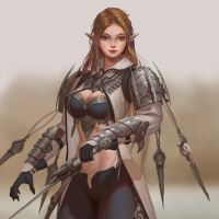 pointed ears characteristic of elves in fantasy literature and media. The character is wearing armor that includes shoulder guards and a breastplate, suggesting she might be a warrior or fighter type within the context of her story. Her outfit also has a hint of medieval design elements, contributing to
