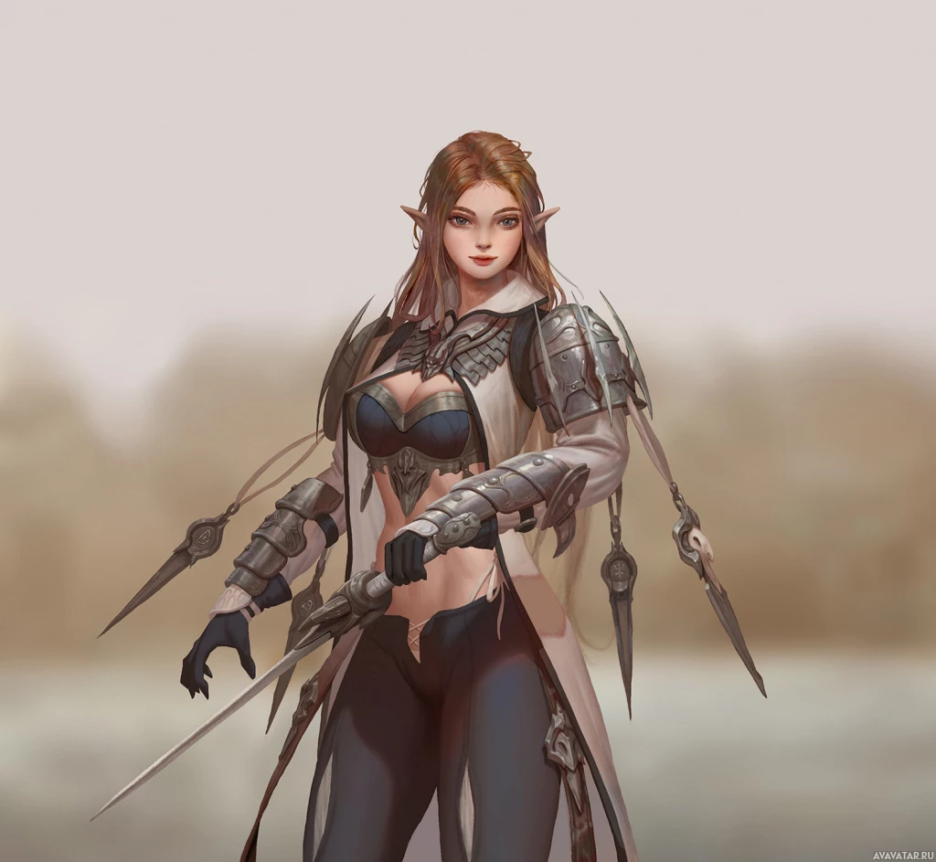 the fantasy setting. She is holding a sword with both hands, indicating readiness for combat. The background is minimalistic, allowing the focus to remain on the character herself.