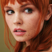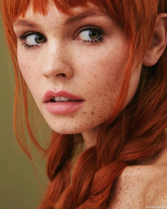 На картинке изображена молодая женщина с рыжими волосами, заплетенными в косички. Ее макияж естественный, а на щеках видны веснушки. Кажется, что она смотрит немного в сторону от камеры с нейтральным выражением лица.