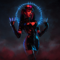 an animated character. The character appears to be styled as a cyberpunk or futuristic woman with a dominant,