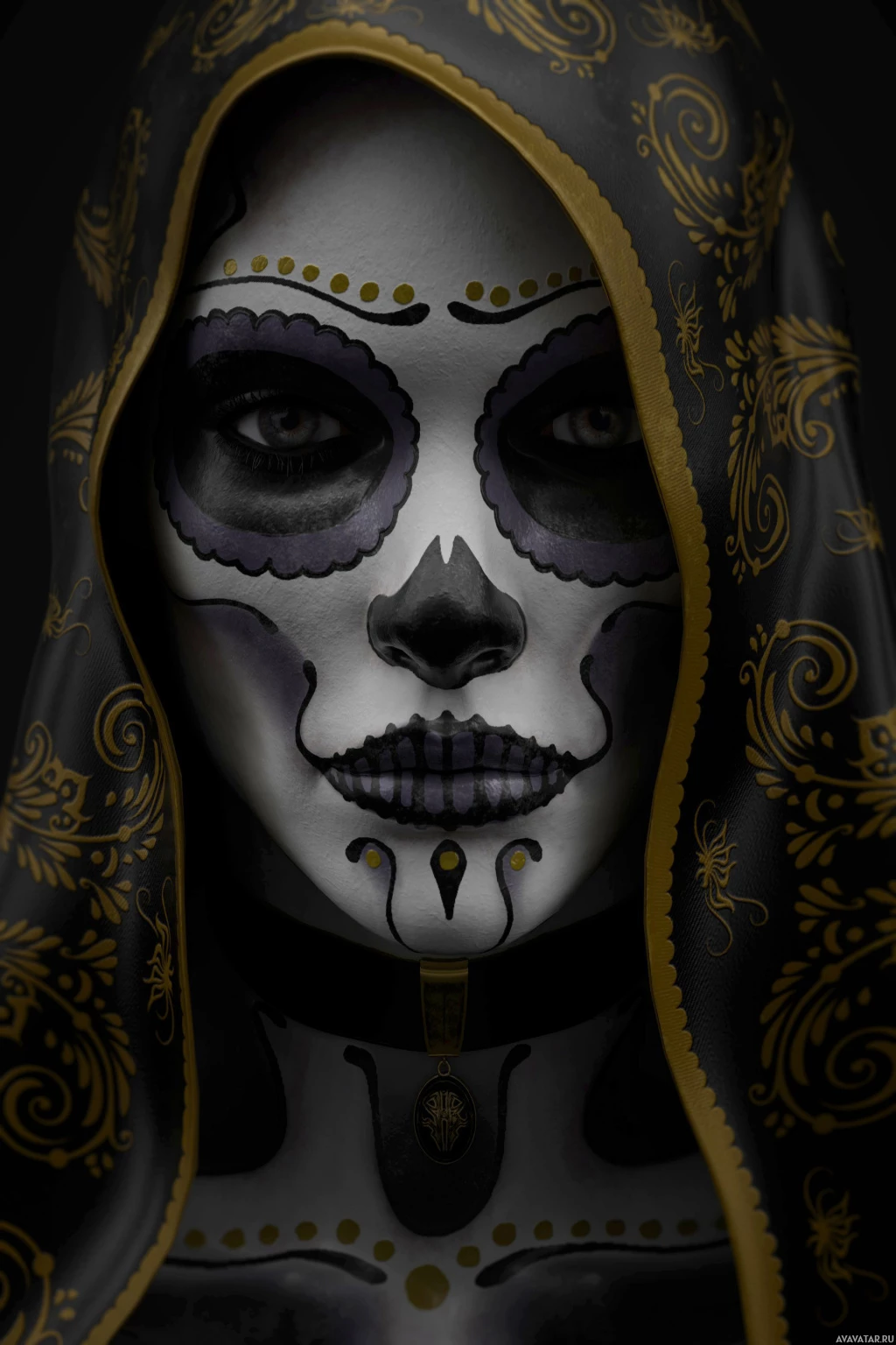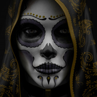 a sugar skull, which is typically colorful and adorned with designs, representing death but also celebrating life. The person is wearing face paint and makeup to emphasize the skull-like appearance, and they are dressed in ornate clothing that includes embellishments like jewelry and