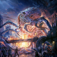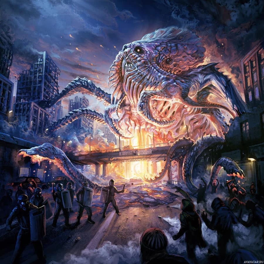 The image features a dramatic and fantastical scene where a large, menacing creature that resembles