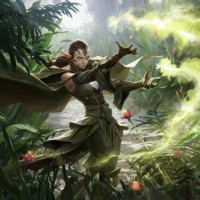 magical energy emanating from their hand. The setting appears to be a dense jungle or