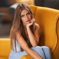 The picture shows a young woman sitting on a yellow chair. She has long brown hair and is wearing a blue outfit with light-colored pants. Her right hand is resting on her chin, giving an impression of thoughtfulness or contemplation.