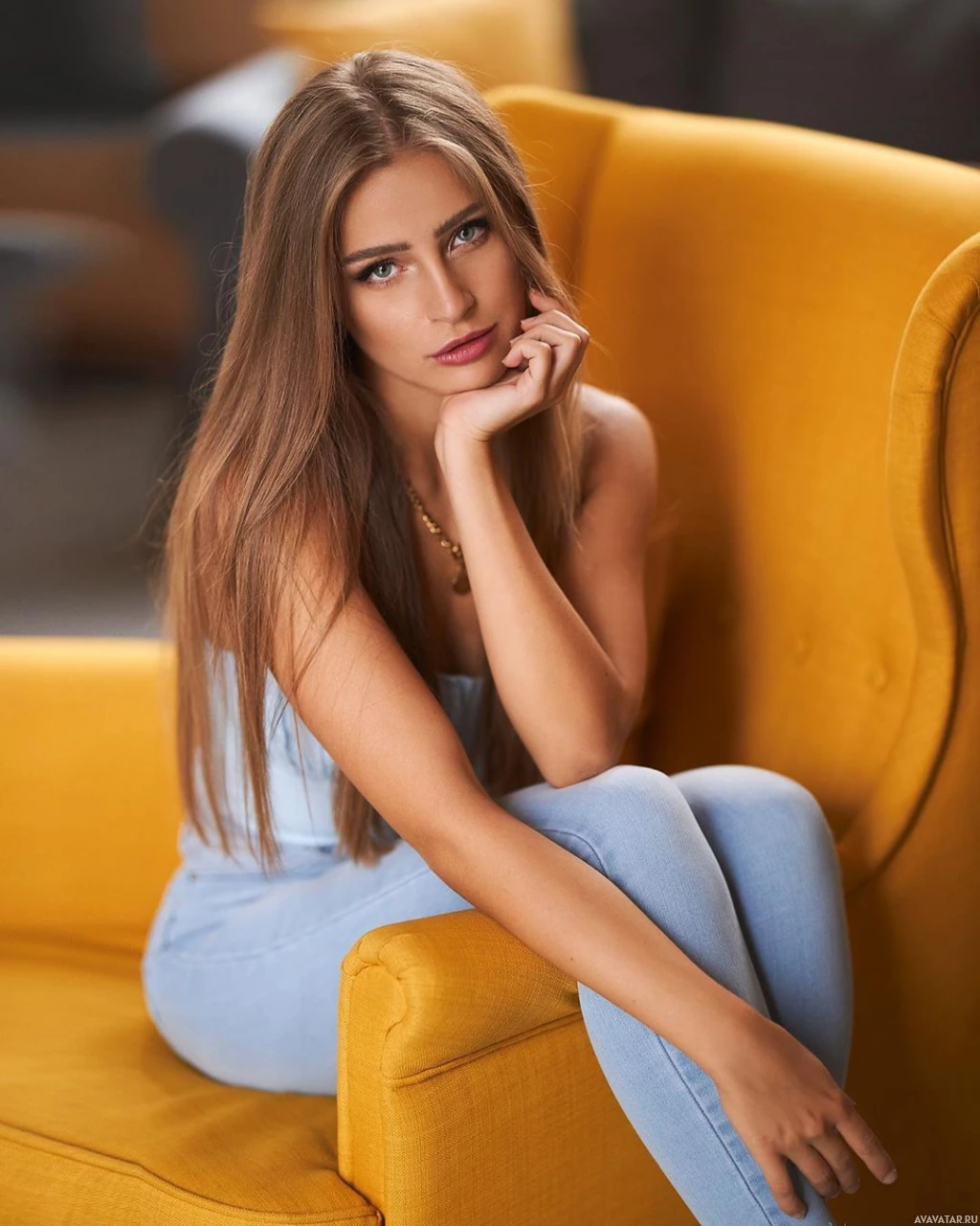 На картинке изображена молодая женщина, сидящая на желтом стуле. У нее длинные каштановые волосы, она одета в голубую одежду и светлые брюки. Ее правая рука покоится на подбородке, создавая впечатление задумчивости или созерцания.