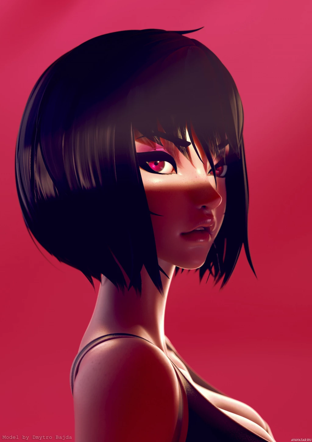 dark hair, striking red eyes, and appears to be stylized with exaggerated features that are common in certain types of artwork or animation. Her expression is calm and she seems to be looking directly at the viewer. There's