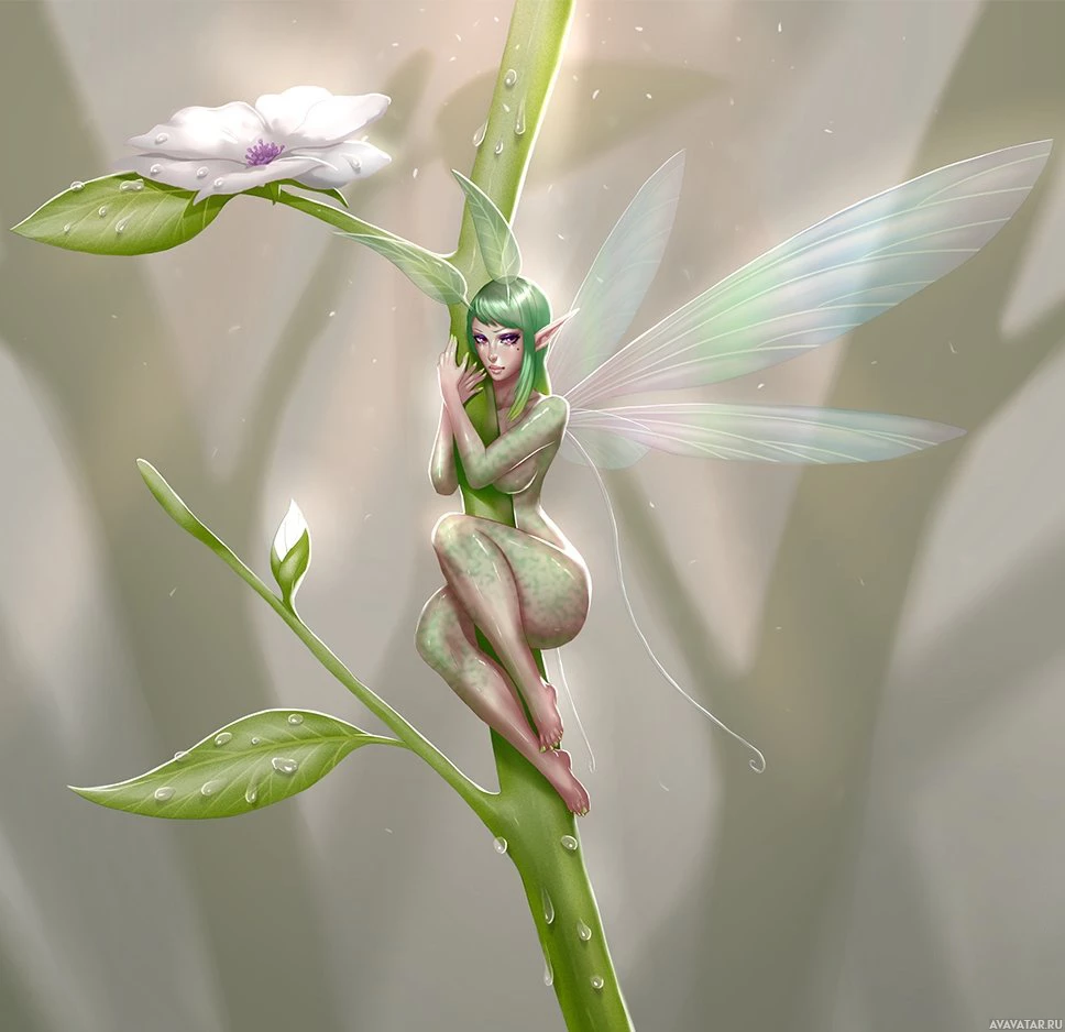 green skin, sitting comfortably on a leafy plant stem. The fairy's body is adorned in