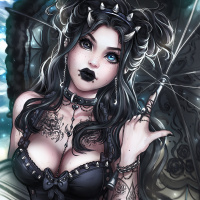 illustrated character who appears to be an ethereal or fantasy-inspired female. She has dark hair,