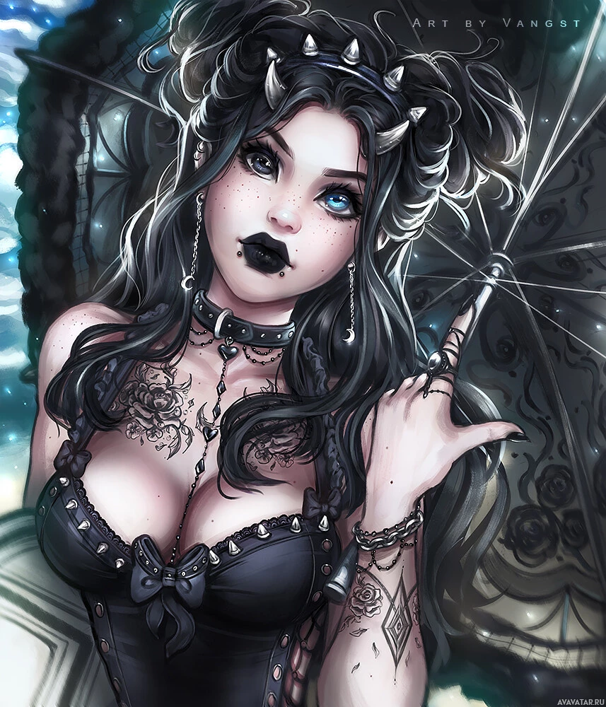 a corset top with lace elements and what looks like a bowler hat or an umbrella behind her. The style of the illustration suggests she might be from
