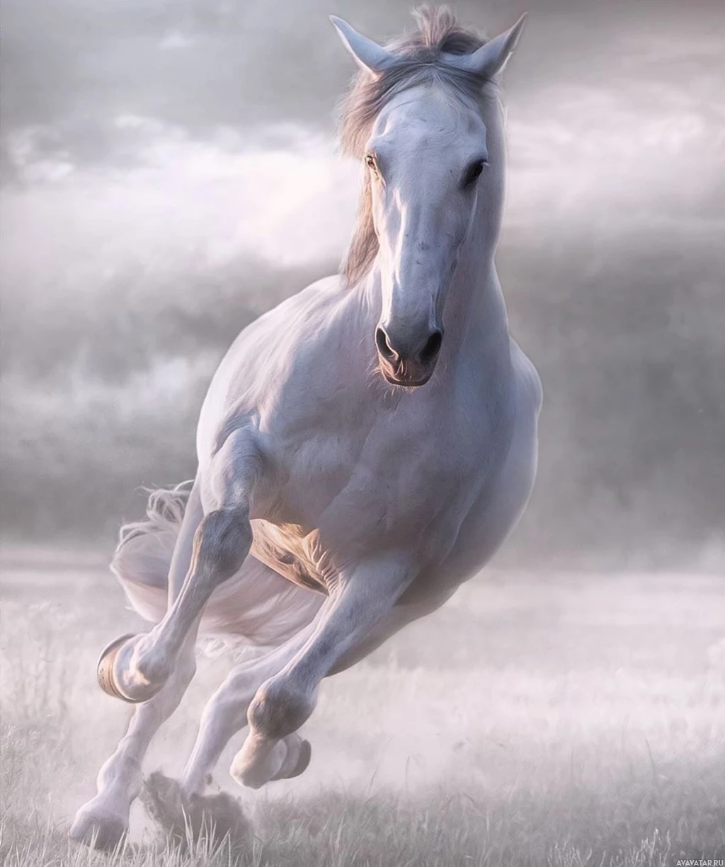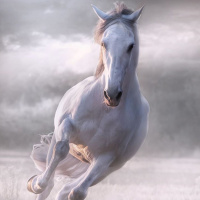 a white horse running at full speed, creating a sense of motion and power. The horse is captured mid-stride with its mane and tail flowing behind it, suggesting that the photo was taken while the horse was in motion. The background appears to be a misty or foggy environment, which adds a dramatic and somewhat ethereal quality to the image. The horse's