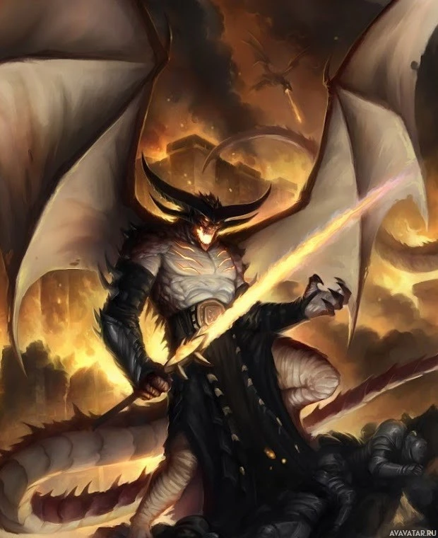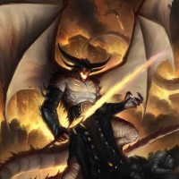 a fantasy scene featuring a character that appears to be a demon or a mythical creature. This figure has wings and horns, typical of demons in fantasy artwork, and is armed with a sword, suggesting a warrior-like role. The background suggests a chaotic or battle setting with smoke and fire elements, which adds to the dramatic and intense atmosphere of the image.