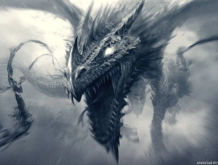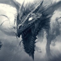 sharp teeth, and a muscular body with scales. The dragon appears to be in an aggressive or threatening pose, possibly roaring or breathing fire. The background suggests a stormy or dramatic setting, which is common for depictions of
