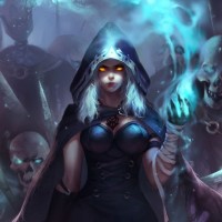 dark clothing with hood and what appears to be a cape or cloak. Her expression is intense, and she holds a glowing