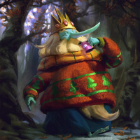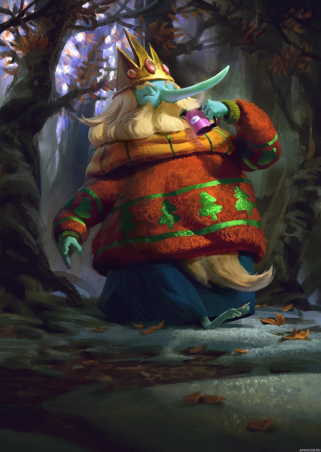 white hair and is wearing a green, gold, and red cloak with fur trim. They appear to be sitting on a rock or boulder in a forest setting with