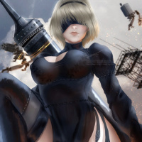 the video game "Nier: Automata." She is wearing a black armor and wielding a large sword, which are typical elements of her