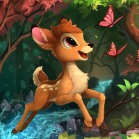 an animated scene featuring a deer character. It appears to be from a movie or cartoon, as indicated by the stylized and colorful animation. In the foreground, there's a fawn with spots on its coat running through what seems to be a forest setting with trees and rocks. The deer is smiling and appears happy. There are also butterflies flying around it, adding to