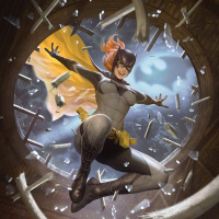 На картинке изображен женский персонаж в образе Бэтгерл, супергероини из вселенной DC Comics. Она находится в центре действия, выпрыгивая из чего-то, что кажется взрывом или вспышкой энергии. Ее костюм состоит из черно-серого наряда с желтым поясом. На заднем плане изображена ночная обстановка с эффектными световыми эффектами, которые подчеркивают динамичность ее позы.