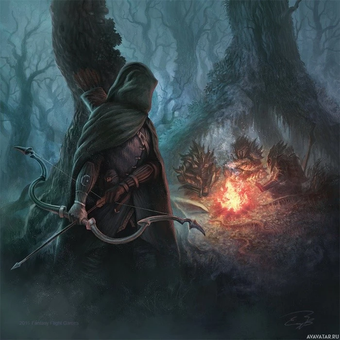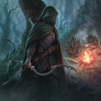 a fantasy scene with an archer dressed in medieval attire, including a hooded cloak and holding a bow. They are standing amidst a forest setting at night, with