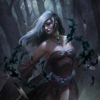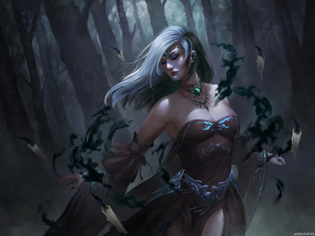 white hair and is wearing a costume with dark tones and intricate details that suggest she might be a witch or magical being. Her eyes are closed as if in contemplation or casting a spell. The background depicts a misty,