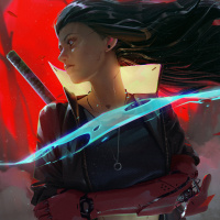an intense expression on her face and is holding a sword that's emitting blue energy or light. There are elements in the background that suggest
