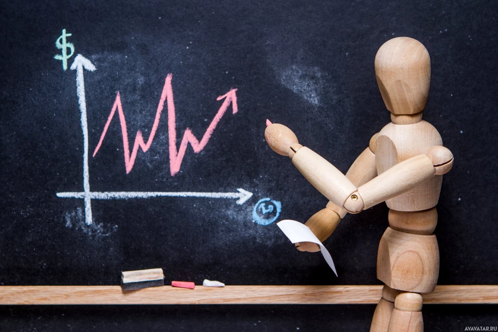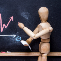 a human figure interacting with a chalkboard. On the chalkboard, there is a chart depicting an upward trend or growth in data, which could represent financial figures or some other type of measurement over time. The person on the left side of the image appears to be pointing towards the chart on the board, possibly discussing or explaining the data represented by the graph. There are also some notes and