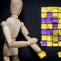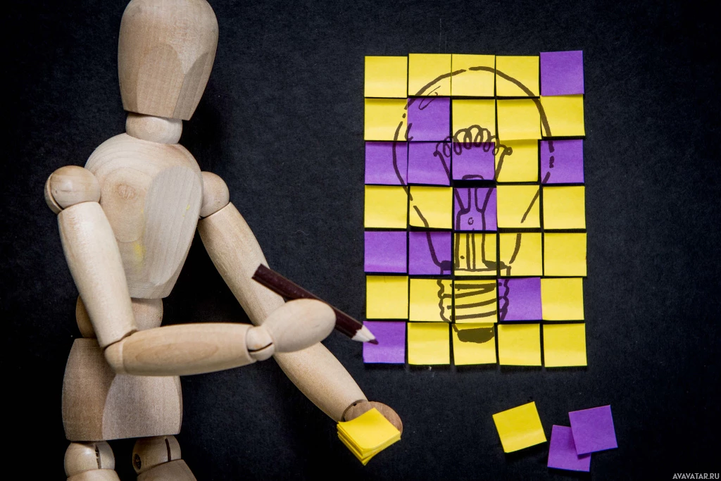 a piece of paper, and the background features numerous sticky notes with various drawings on them, including one that resembles an idea or light bulb symbol. This arrangement suggests a theme related to creativity or