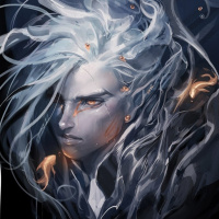 The image depicts an illustrated character with long, flowing white hair and what appears to be elven features. The character has a serious expression on their face and is set against a dark background that could suggest a fantasy or otherworldly setting.