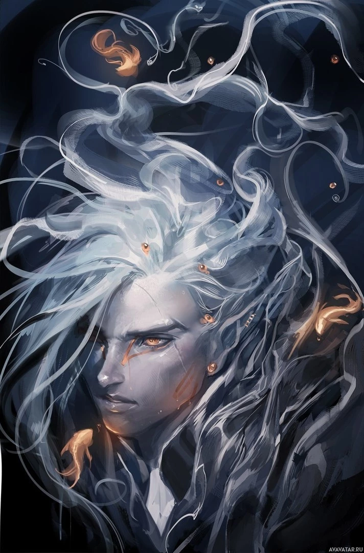 На картинке изображен персонаж с длинными распущенными белыми волосами и чертами, напоминающими эльфийские. У персонажа серьезное выражение лица, и он расположен на темном фоне, что может наводить на мысль о фантастической или потусторонней обстановке.