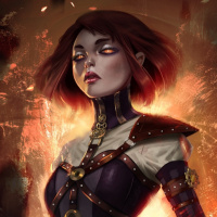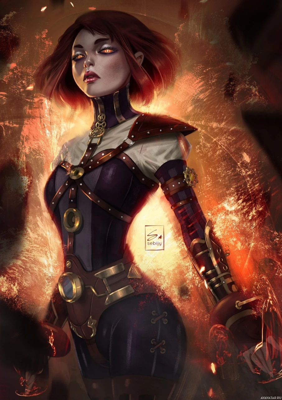 metallic armor that appears to be of a fantasy or science fiction style, which may suggest she is from a game, book, or movie series that features such attire. The background has a fiery and dark ambiance, which could imply