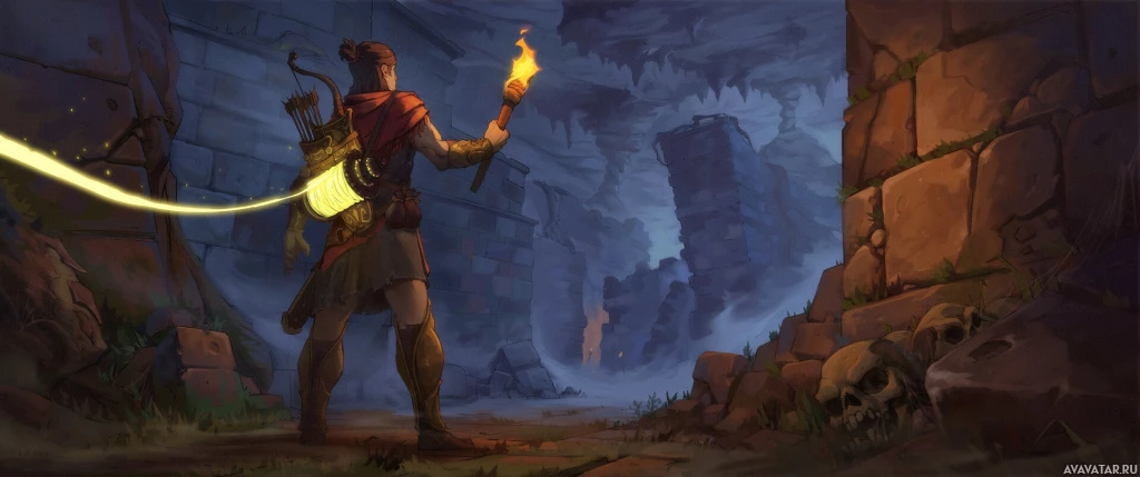 underground passage. They are holding a torch in one hand and a bow in the other, suggesting they may be about to explore the cave or prepare for an adventure that involves archery. The setting appears to be