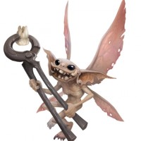 hybrid creature has bat-like wings and is holding what seems to be a staff or wand in one hand and a skull in the other. The overall aesthetic is dark and somewhat menacing, which aligns with horror themes.