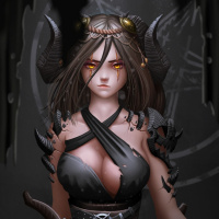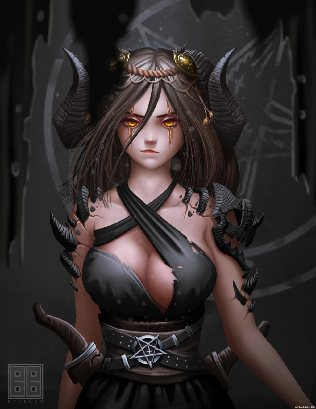 a young woman. She has horns protruding from her head and is wearing a black and gold armor with some