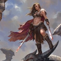Картинка показывает женский персонаж, одетый в то, что кажется древним или фэнтезийным доспехом, предполагая, что она может быть из исторической или фэнтезийной обстановки. Она имеет длинные волосы и носит плащ или плащ красного цвета. В руках она держит перед своим телом два меча. На заднем плане изображен скалистый утес или горный пейзаж с облаками в небе.